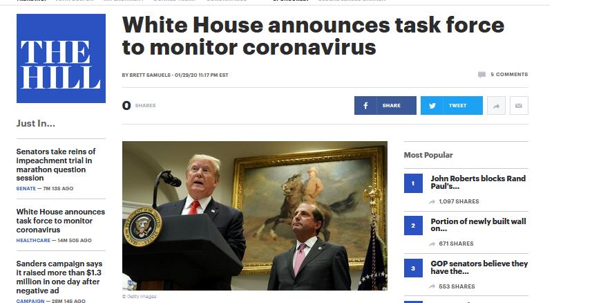 《国会山报》称,白宫新闻秘书斯蒂芬妮·格里沙姆在一份最新声明中称,特别工作小组自周一(27日)以来每天都会开会,将领导政府在监测与控制病毒所致疾病方面的应对行动。报道说,当地时间29日早些时候,特朗普就在白宫主持了一次有关会议。