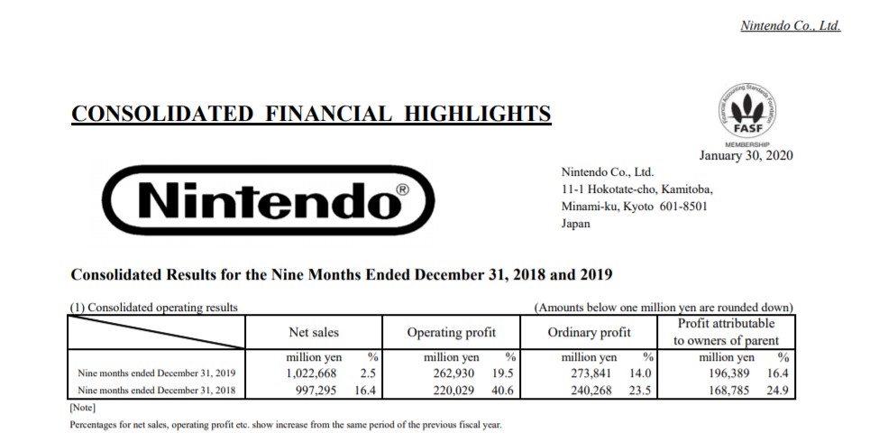 今天(1月30日)任天堂公开2020财年第三季度财务报告,报告显示任天堂新财年的净销售额为10226亿日元,同比增长2.5%(上财年同期为9973亿日元),营业收入为2629亿日元,同比增长19.5%(上财年同期为2200亿日元)。