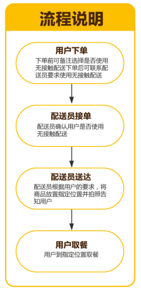 服务流程共包括用户下单、配送员接单、配送员送达、用户取餐四个步骤。若其中出现异常情况,需根据相应的处理流程机制,由配送员转交给客服人员进行后续流程的处理。