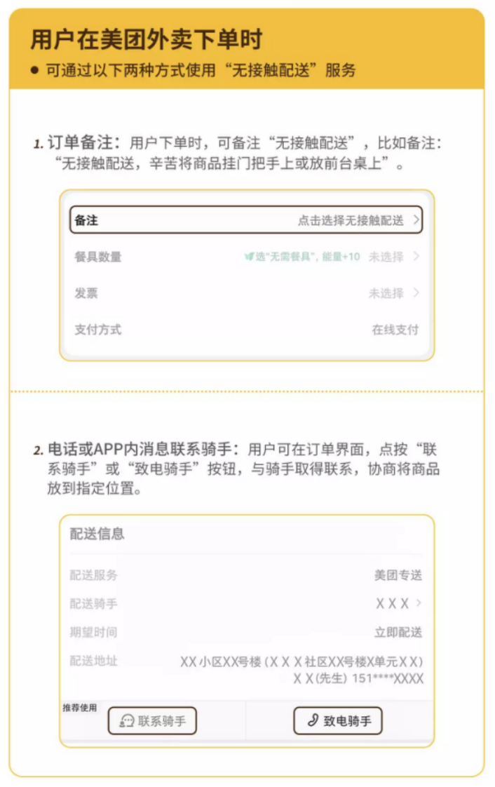 用户在下单时,可通过“订单备注”、电话、APP内即时通讯系统等方式,与骑手协商一个商品放置的指定位置,如公司前台、家门口等,送达后骑手将通过电话和APP内即时通讯系统等渠道通知用户自行取餐。