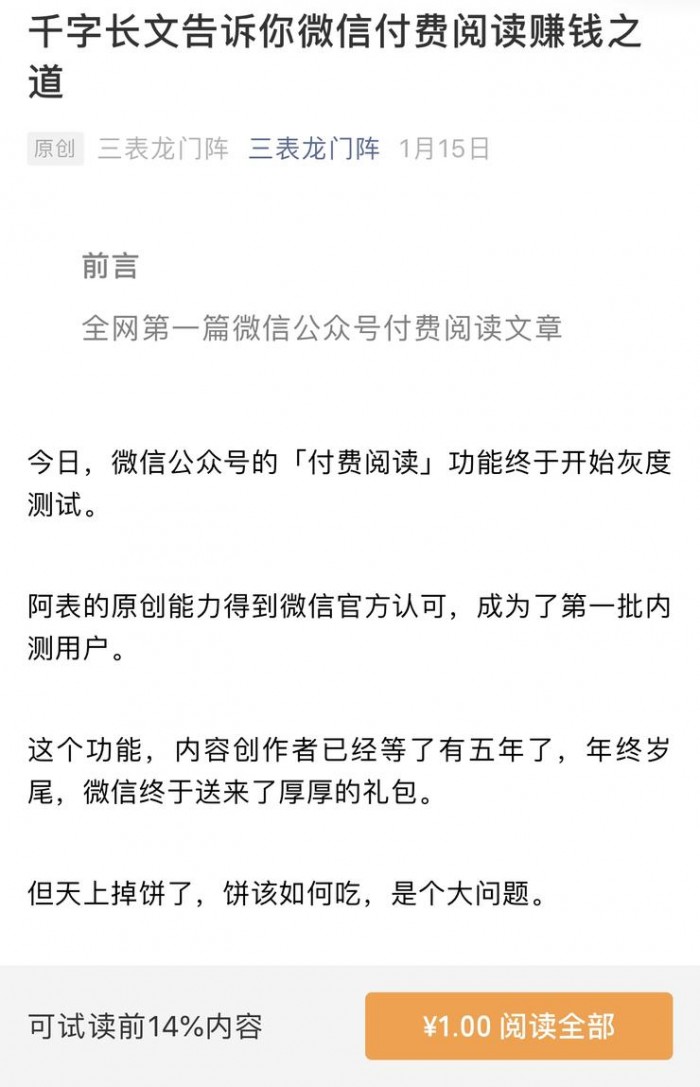 2020 年 1 月 15 日,订阅号“三表龙门阵”作为首批内测公众号,已经发出了第一篇微信公众号付费阅读文章,用户付费前只可阅读前 14% 内容,而 iOS 端用户点击付费后,也将会跳转至 APP Store 付费界面,同时,文章留言功能也仅向已付费用户开放。