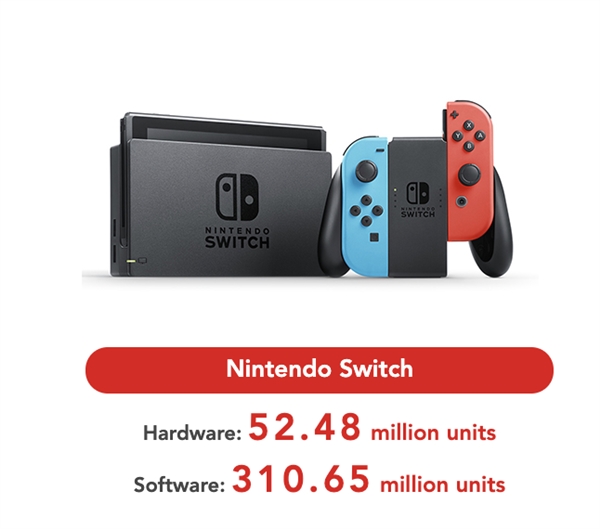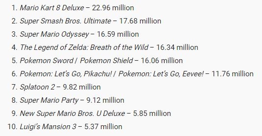 截至2019年底,任天堂Switch总销量已达5248万台,软件3亿套。软件销量前三名分别是:《马里奥赛车》(2296万份)、《任天堂明星大乱斗》(1768万份),以及《超级马里奥:奥德赛》(1659万份),位列销量榜前十的均为第一方作品: