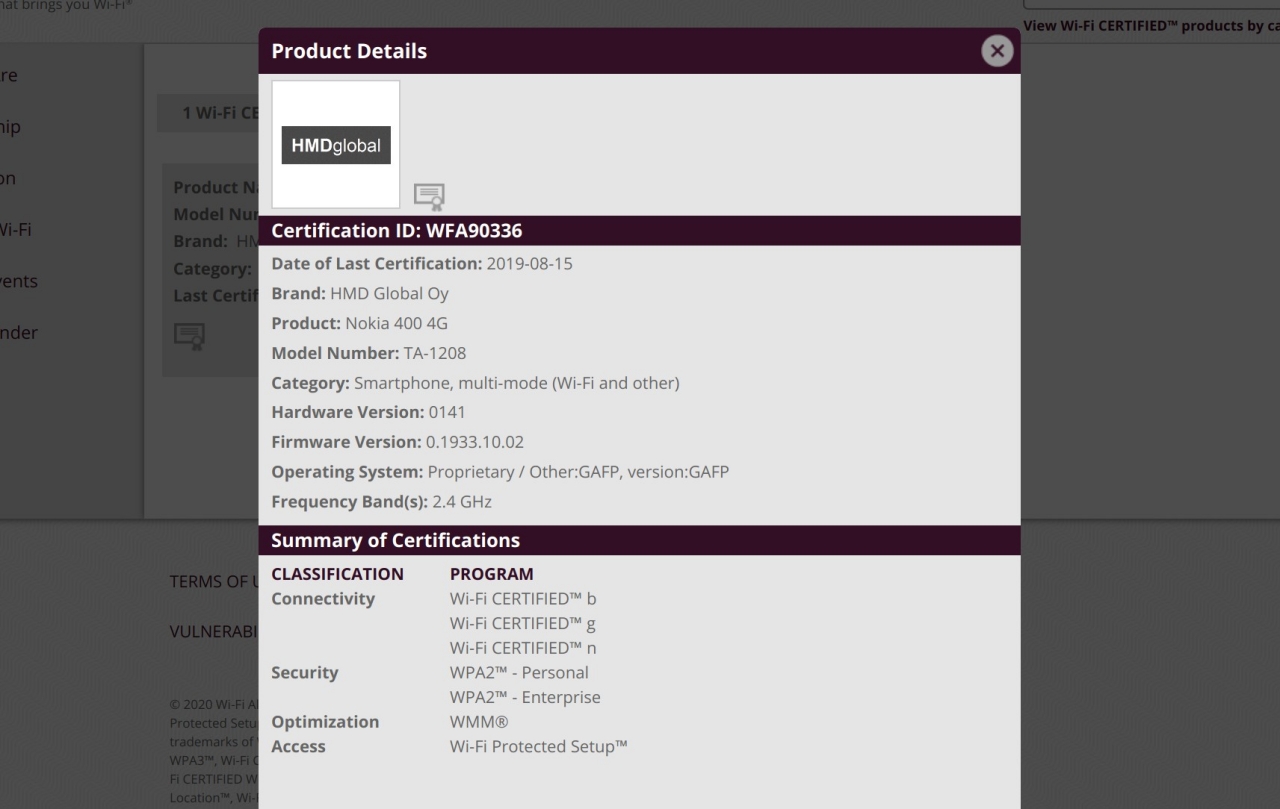 HMD Global的功能手机通常运行在KaiOS(自定义移动平台)上,该平台获得了对Google最重要的一些应用程序(包括YouTube,地图甚至Assistant)的支持。但是,Wi-Fi联盟将诺基亚400列为使用“ GAFP”。这个名称也恰好出现在较早的Android功能手机泄漏中,该泄漏将其标识为“Iron GAFP”。