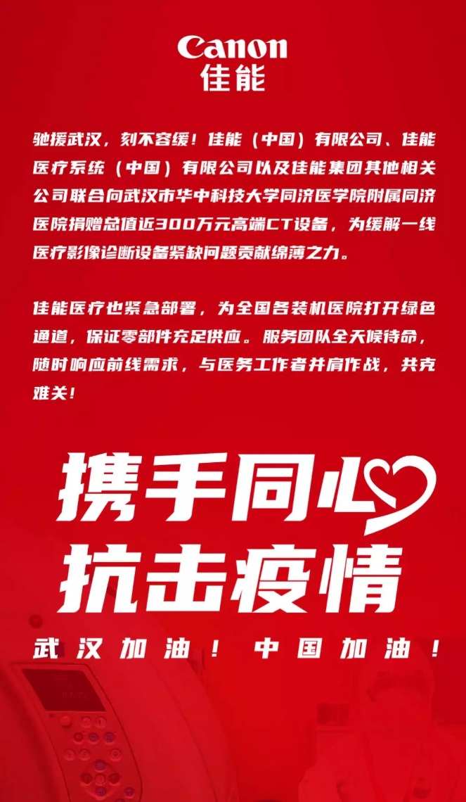 1月30日,佳能(中国)有限公司、佳能医疗系统(中国)有限公司以及佳能集团其他相关公司联合宣布,通过中国国家卫生健康委员会紧急向武汉市华中科技大学同济医学院附属同济医院捐赠总值近300万元人民币的“佳能医疗光影28排CT”设备,用于进行新型冠状病毒肺炎的一线临床诊断,以缓解当地医疗影像检测设备紧缺情况。