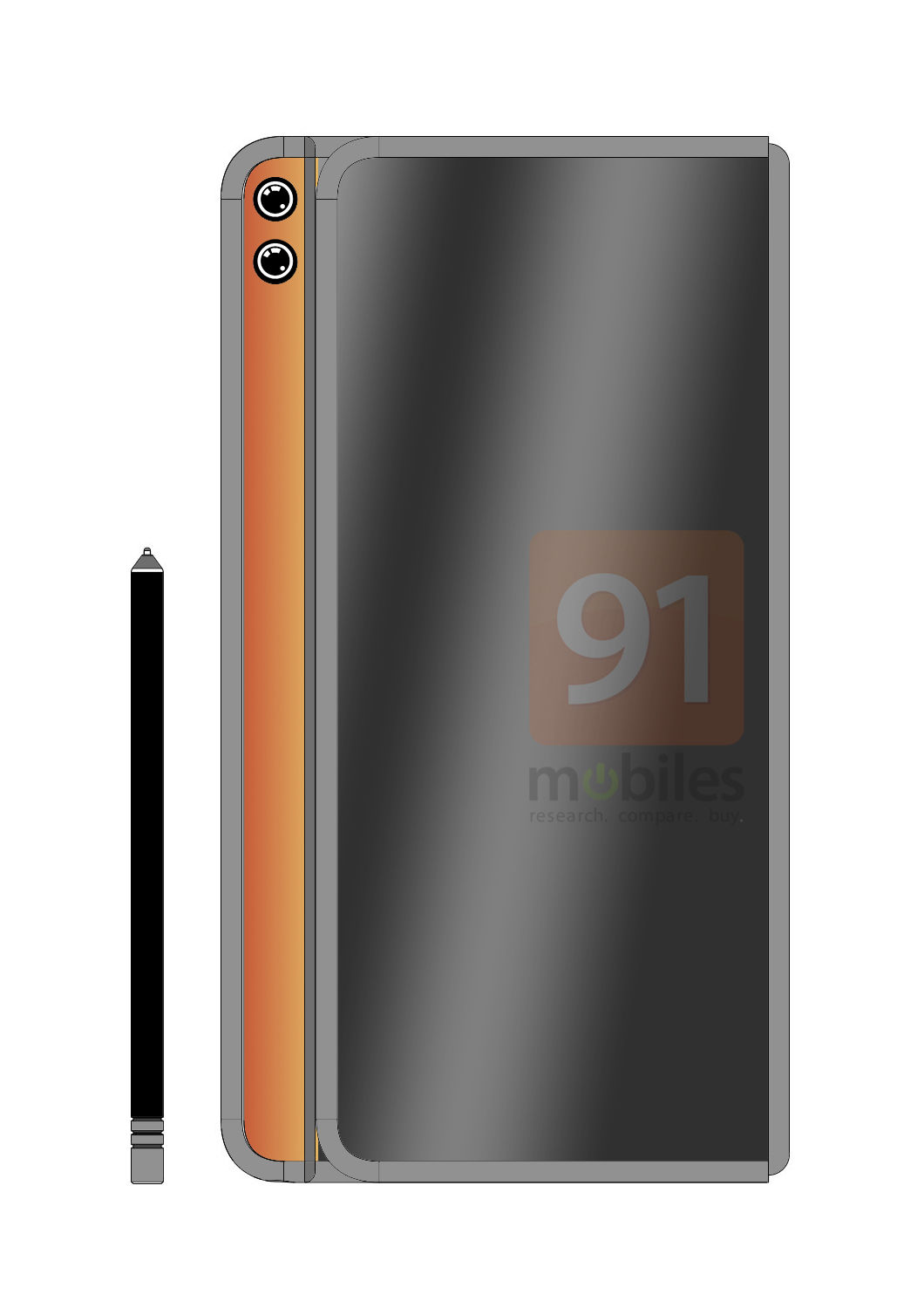 Mate X2似乎是从向内折叠而不是向外折叠,而显示屏将带有一个垂直的侧边栏,该侧边栏似乎具有辅助显示屏,后方的四后置摄像头设置和前部的双摄像头。更为有趣的是,今年的Mate X2的垂直侧边栏还配有手写笔,就像是Galaxy Note系列的S Pen一样能够在屏幕上轻松操作。