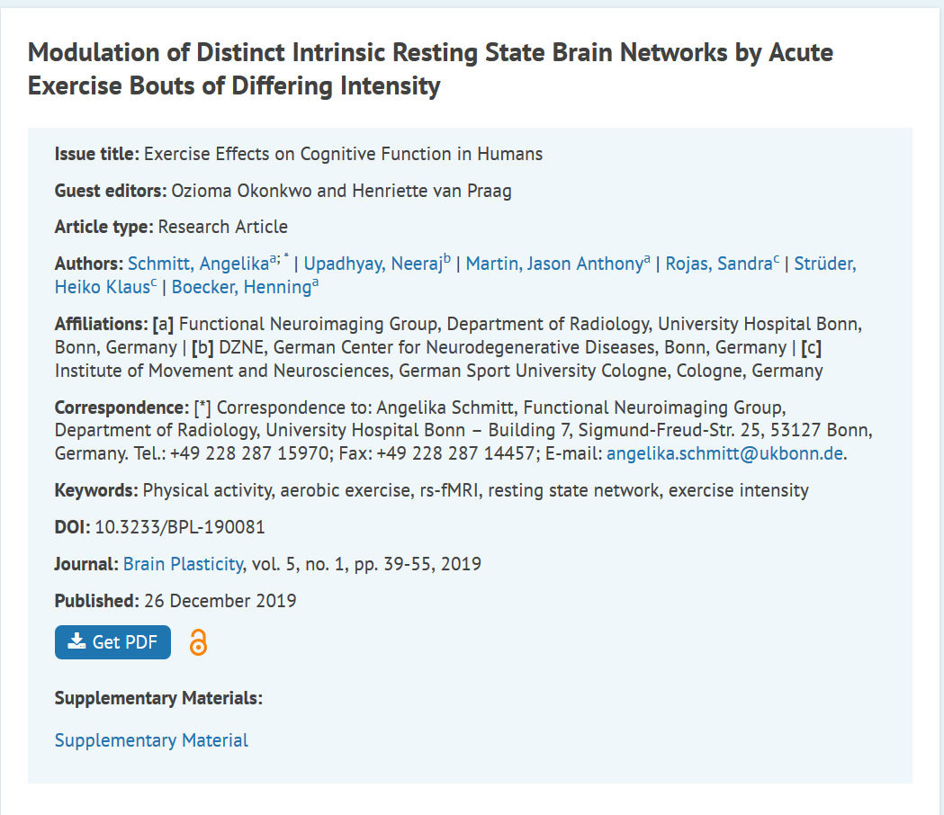 该项目主要揭示了大脑的哪些部分对不同的运动强度会做出什么反应,最终得出初步结论称低强度运动会激活与注意力加工和认知控制有关的大脑网络;而高强度运动主要激活与处理情绪有关的大脑网络。低强度和高强度运动都引起情绪的积极变化,而不良情绪没有“明显”变化。然而,发现高强度运动会增加情感/情感加工背后的大脑网络的连通性,并降低与运动功能相关的区域的连通性。