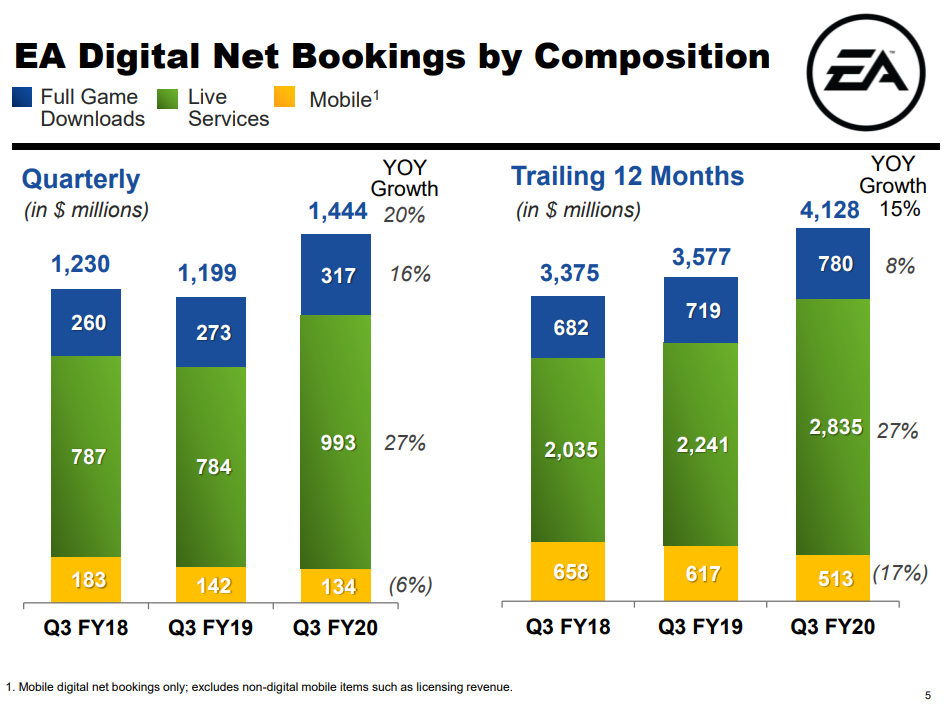EA 2020财年第三季度(2019年10月1日至2019年12月31日)营收达到了15.93亿美元,净利润为3.61亿美元。在该季度内EA推出了《极品飞车21》、《植物大战僵尸:和睦小镇保卫战》和《星球大战绝地:陨落的武士团》等新作。