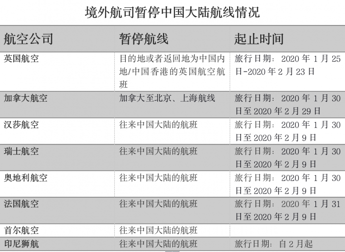 其中,国内航司取消2200余班,境外航司取消1900余班。新加坡、泰国、柬埔寨三个国家的航班减少班次最多。英国航空、汉莎航空、法国航空、加拿大航空、瑞士航空等境外航司暂停了往返内地的航班。