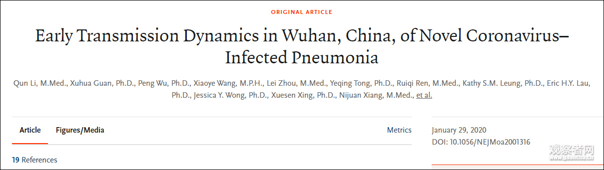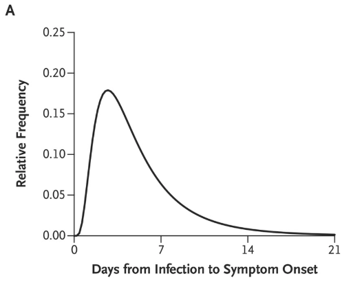 1月29日,中国疾病预防控制中心、湖北省疾病预防控制中心等单位有关专业人员共同在《新英格兰医学杂志》发表了题为《新型冠状病毒感染的肺炎在中国武汉的初期传播动力学》的论文。该论文对武汉市截至2020年1月22日最先确诊的425例病患的人口特征、暴露史、疾病史进行了分析,从而推断出新冠病毒在流行病学上的延时分布。
