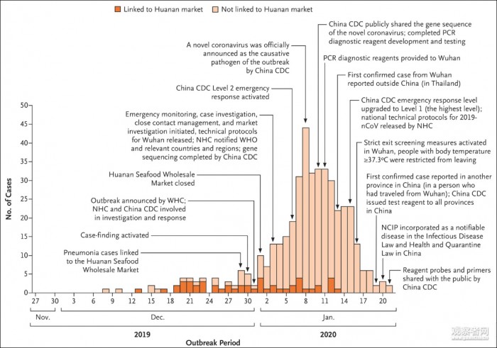 论文给出有关既定数据的分析,包括:这425名确诊患者,平均年龄为59岁,其中56%为男性。而在1月1日前发病(并非确诊)的病例中,有55%和武汉华南海鲜市场有关;1月1日后发病的患者中,只有8.6%和华南海鲜市场有过接触。