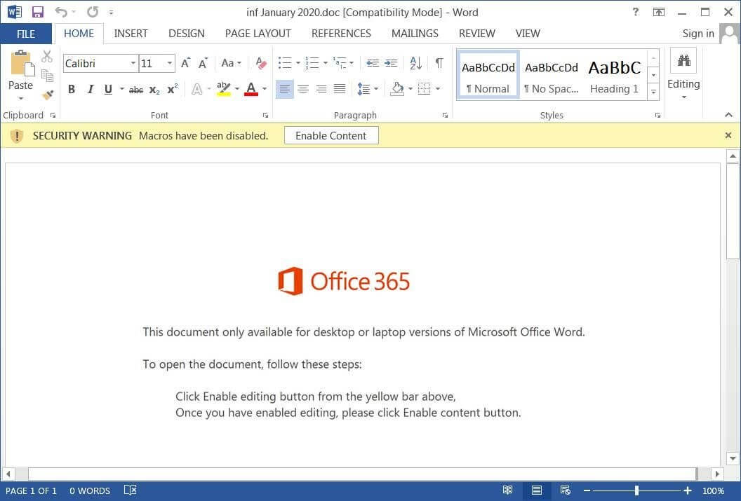 这些电子邮件声称在附件中提供了有关如何预防冠状病毒的建议。打开这些Word文档会弹出一个Emotet Office 365文档模板,该模板要求受害者“启用内容”以查看所有内容。一旦电脑受到感染,它就会被用来向其他目标发送恶意垃圾邮件,并将其他恶意软件安装到设备上,进而可以集用户凭据,浏览器历史记录和敏感文档,并且打包并发送到攻击者控制的存储服务器当中。