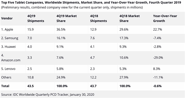近日,知名数据统计机构IDC发布了2019年第四季度平板电脑产品市场统计数据。在2019年10月-12月期间,全球共卖出了4350万台平板电脑,同比下降0.6%。其中绝大部分品牌的平板电脑都遭遇了较大程度下滑,而苹果用iPad力挽狂澜,以一己之力复苏了整个平板市场。