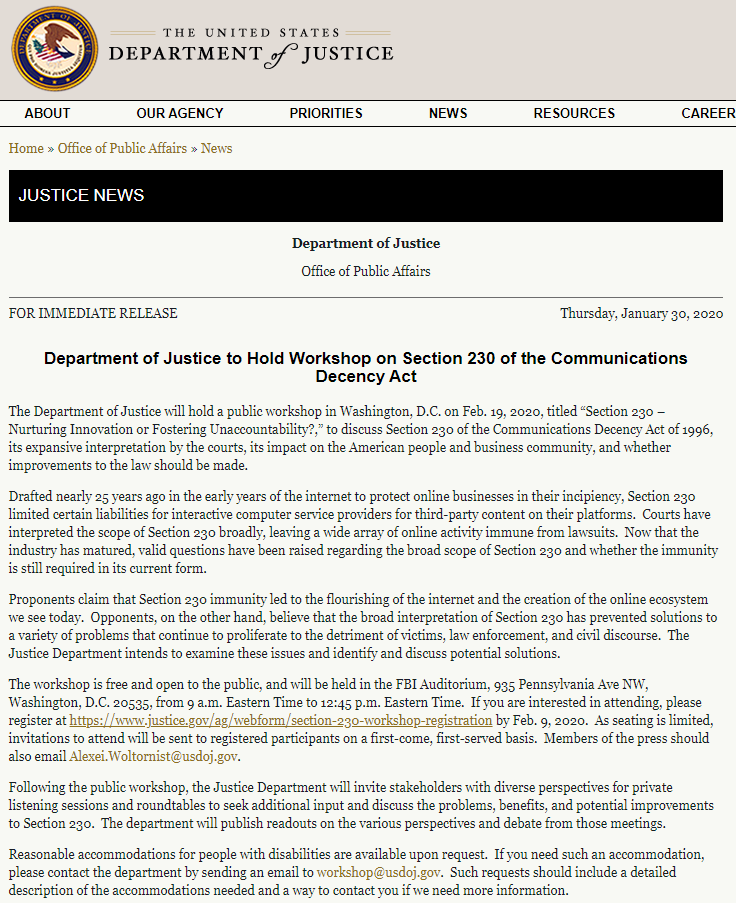 Techdirt创始人Mike Masnick还指出,第230条不涉及联邦犯罪-因此,如果这些公司运允许滥用,司法部可能已经对其提起诉讼。这项法案将威胁到更广泛的赔偿责任,从而使它制定了一套新的规则。