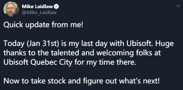 Laidlaw后以创意指导身份跳槽去育碧负责一款尚未宣布的作品,据说逼格很高,高到Laidlaw不惜横越加拿大从埃德蒙顿跑到魁北克。