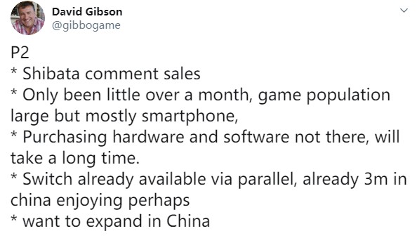 据分析师David Gibson在推特上公布的消息,在近日的财报问答会上,任天堂社长谈到了关于中国市场的相关话题,并首次明确了一个数字,那就是目前在中国大陆大约有300万Switch用户(估算数据,虽然没有明确说明,但应该是行货+水货)。