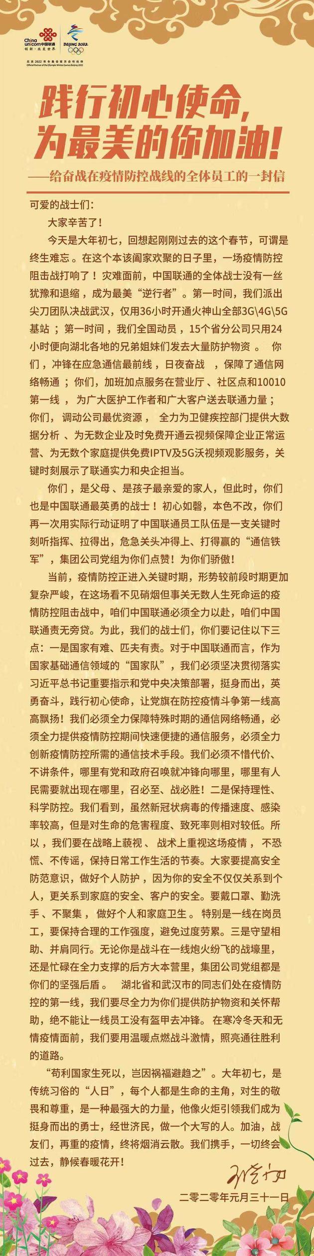 他表示,当前疫情防控正进入关键时期,中国联通责无旁贷,全力以赴。必须全力保障特殊时期的通信网络畅通,必须全力提供疫情防控期间快速便捷的通信服务,必须全力创新疫情防控所需的通信技术手段。