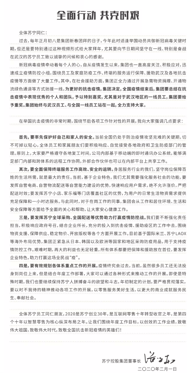 张近东在邮件中表示,在社会援助方面,集团正全力通过开展急需物资捐赠、开通物流绿色通道等方式驰援一线。为更好的抗击疫情,集团决定全国疫情结束后,集团要总结在抗击疫情中表现优秀的个人和团队,予以特别嘉奖,尤其是对于武汉地区的一线员工,集团要给予重奖。集团始终与武汉员工、与全国一线员工站在一起,全力支持大家。