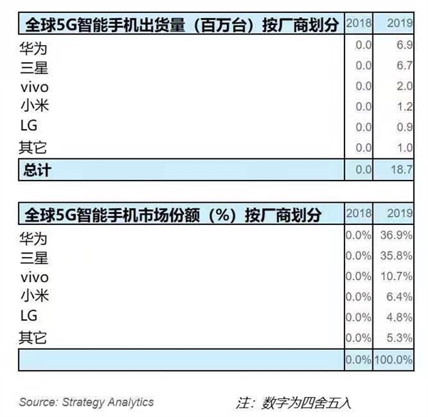 根据市场研究机构Strategy Analytics最新发布的研究报告数据,2019年全球5G智能手机出货量接近1900万台,需求远高于预期。其中,华为手机占全球5G智能手机市场份额的37%,位居第一;而三星以36%的份额位居第二。