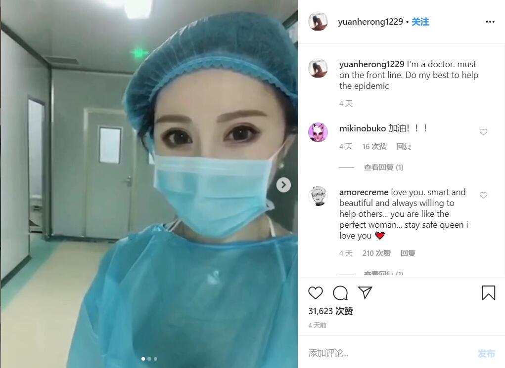 近日国内冠状病毒疫情爆发,袁合荣在Instagram上发布了一批身着医生制服的照片,配文却非常耐人寻味。