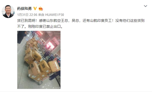 陆勇发文称自己和云南大学印度研究院柳老师初五跑到印度,终于发回3000个护目镜,3000个n95。“坐着运货三轮冲到机场,49箱直接发行李,印度警察蜀黍还蛮好,听说是中国医生要,放行。感谢山东航空,感谢昊邦集团和一心堂!继续努力中!”