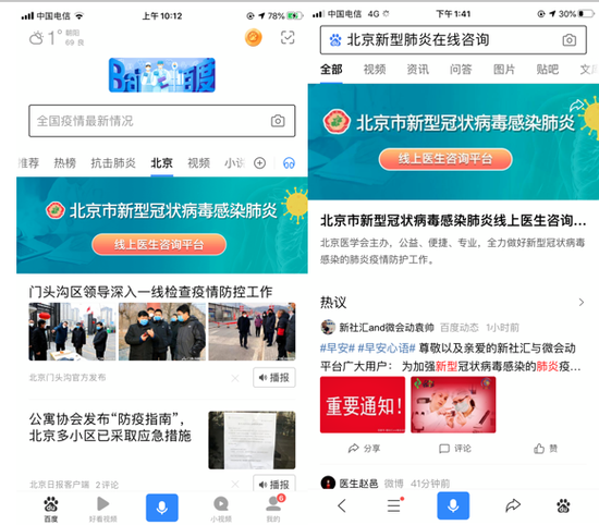 用户可通过百度App搜索“北京新型肺炎在线咨询”,或进入百度App北京频道,点击页面顶部图片进入平台。平台涵盖权威解读、专家视频解读、防疫知识学习、专家在线咨询四大功能。