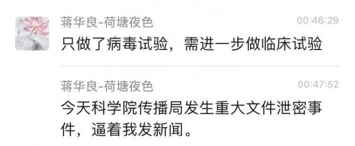 在本文接近截稿时,《知识分子》获的一个截屏,据传来自该项研究的牵头人蒋华良院士,他深夜发表澄清:“只做了病毒实验,需进一步做临床试验”,“今天科学院传播局发生重大文件泄密事件,逼着我发新闻”。也从侧面证实前述专报文件确有其事。