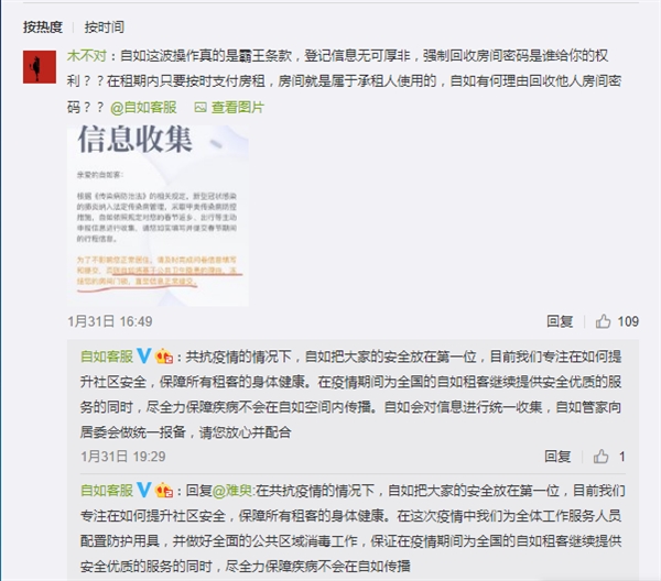 对此有网友提出质疑,表示自如这波操作属实霸王条款,登记信息无可厚非,强制回收房间密码是谁给你的权利?在租期内只要按时支付房租,房间就是属于承租人使用的,自如有何理由回收他人房间密码?