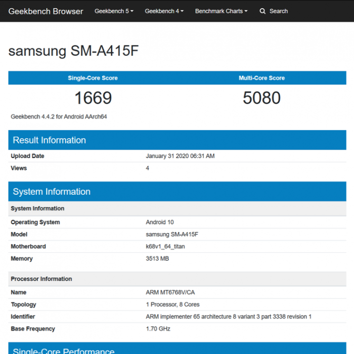 近日,Geekbench 4网站曝光了一款型号为SM-A415F的三星新机的跑分成绩,这款新机疑似为三星Galaxy A41。Geekbench跑分信息显示,这款新机搭载了三星机型中非常少见的联发科处理器——MT6768V/CA(即Helio P65)。