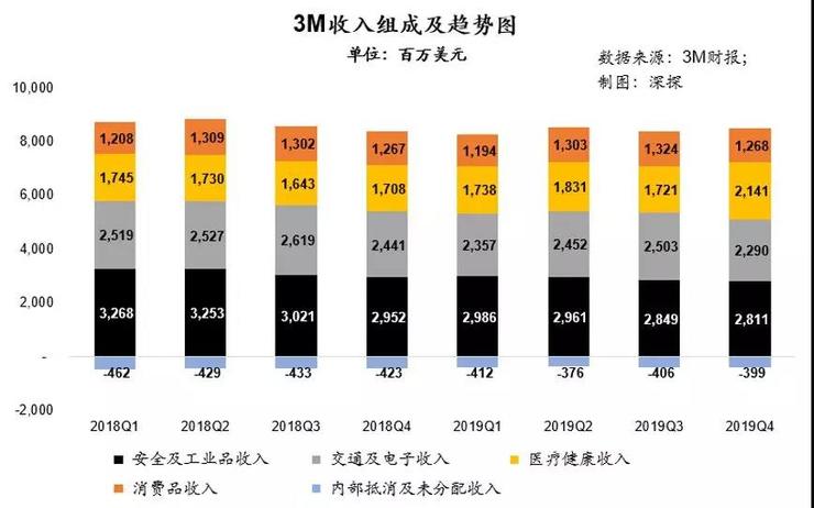 根据《深探》报道,当前 3M 的业务主要包括四部分:安全及工业品、交通及电子、医疗健康、消费品。其中,安全及工业品和交通及电子部门的收入仍然是最重要的来源,分别为 28.11 亿美元及 22.9 亿美元,合计占总收入的 62.9%。