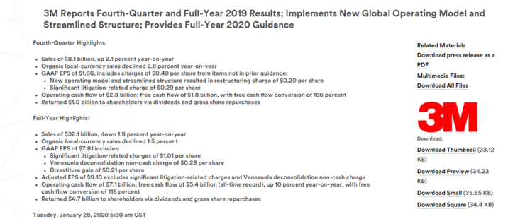 当地时间 2020 年 1 月 28 日,3M 发布了 2019 年四季度及全年业绩报告。