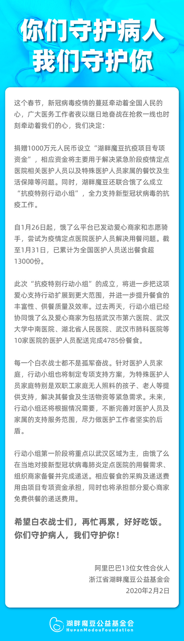 2月2日下午消息,湖畔魔豆公益基金会官方微博、头条发布公告,宣布捐赠1000万元人民币设立“湖畔魔豆抗疫项目专项资金”,用于解决紧急阶段疫情定点医院相关医护人员以及医护人员家属的餐饮及生活保障等问题。同时,湖畔魔豆还联合饿了么成立“抗疫特别行动小组”,全力支持新型冠状病毒的抗疫工作。