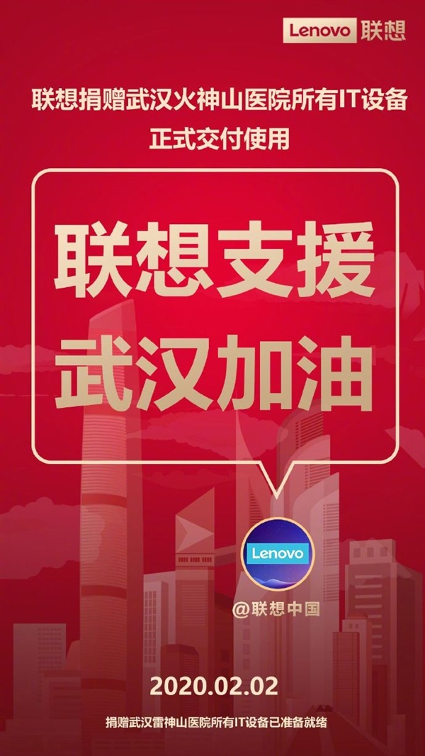 此前在1月26日,联想集团发布官方声明称,联想集团向武汉应急医疗工程紧急援助所需所有IT设备,首批设备已送至武汉蔡甸火神山医院筹建指挥部现场并开始调试。