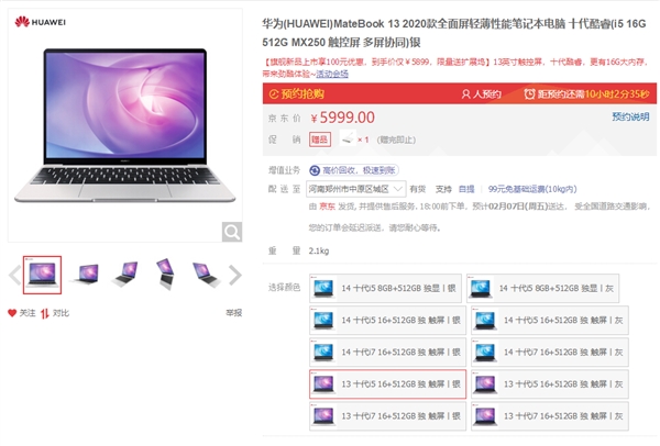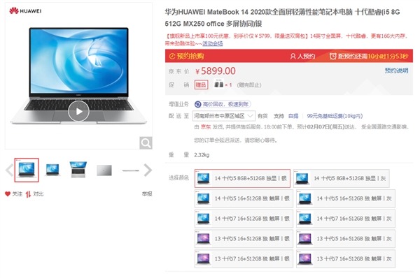 华为马上就会发布的新一代MateBook 13、MateBook 14笔记本已经提前上架京东,今天上午10点08分开启预售,2月7日周五零点开卖。新款MateBook 13/14外观基本没变,主要是升级了配置,包括引入10点触摸屏、Intel十代酷睿处理器、MX250独立显卡、16GB内存、防泼溅键盘等等。