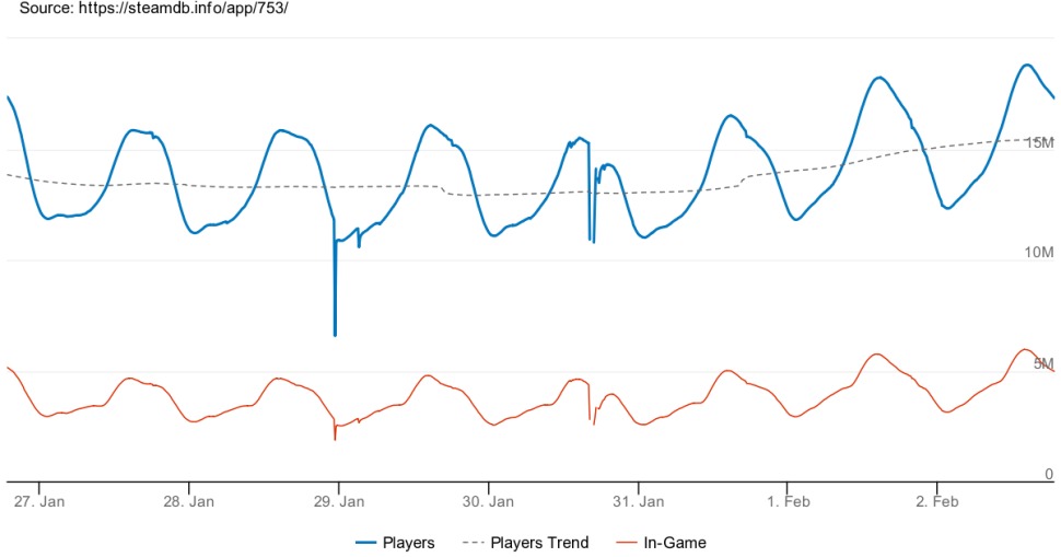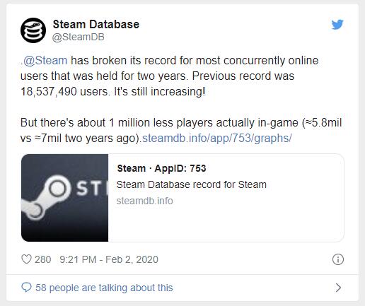 之前的记录是由于大量玩家沉迷《绝地求生》而创造的。目前还不清楚这次是什么原因导致了这一高峰,当然这一高峰的出现时间与Steam所有顶级游戏的高峰游戏时间相吻合。