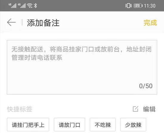 事实上,在此前的1月26日,美团外卖已推出“无接触配送”,并迅速实现全国覆盖。用户在下单时,可通过“订单备注”、电话、App内即时通讯系统等方式,与骑手协商一个商品放置的指定位置,如公司前台、家门口等,送达后骑手将通过电话和App内即时通讯系统等渠道通知用户自行取餐。针对医院地区的送餐,则是通过取餐柜等无接触设备送达。