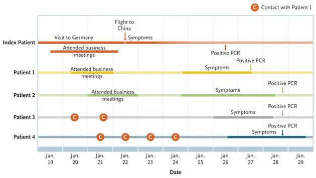 情况发生在慕尼黑当地时间2020年1月24日,一名33岁男子因喉咙痛、发冷和肌痛就诊,该男子无基础疾病。第二天该患者发热至39.1℃,同时伴随咳嗽。第三天傍晚情况好转,1月27日他回去继续工作。