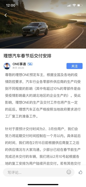 尊敬的理想ONE预定车主,根据全国及各地的疫情防控要求,汽车行业各零部件供应商的生产均受到不同程度的影响(其中有超过10%的零部件是由受疫情影响最大的湖北地区的企业生产的)。受此影响,理想ONE的生产及交付工作也将产生一定的延后。理想汽车正在严格按照当地政府要求进行工厂复工的准备工作。