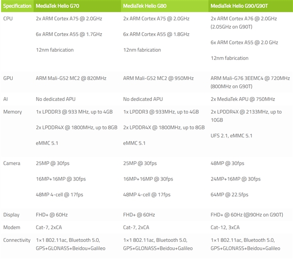 Helio G系列芯片主要参数对比
