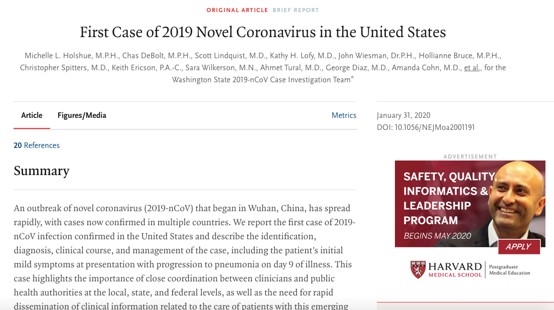 美国首例新型冠状病毒患者在病情恶化后接受Remdesivir的注射治疗,隔天症状出现了大幅改善。1月31日,顶尖医学期刊《新英格兰医学杂志》(NEJM)在线发表了一篇论文,详细描述了此患者就医、诊断、治疗及其临床表现,引起了很大轰动。