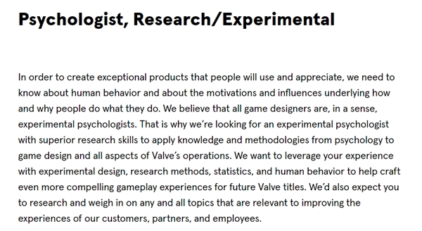 “我们相信所有游戏设计者以某方面来说,都是实验心理学家。因此,我们打算要寻找一位拥有丰富研究经验的实验心理研究员,并将他的专业知识和方法套用在游戏设计以及Valve 的营运方式中。我们希望能够利用这些实验设计、研究方式、统计以及人类行为学的相关经验,来为Valve 未来的游戏作品打造出更加复杂的游玩体验。我们也期待适格者能够持续研究并参与在各种能为我们的消费者、伙伴和员工们改进体验的话题中。”V社在招聘信息中这样说道。