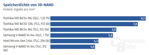 那实际到底如何呢?德国Computerbase网站根据铠侠、西数以往的数据做了个汇总,不同类型的3D闪存的存储密度如下: