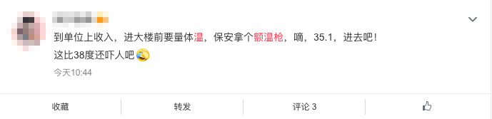然而,在首日开工期间,也有网友遇到单位保安用额温枪测体温测到惊悚数字的情况。