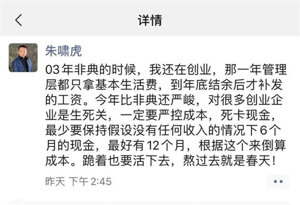 2月3日晚间消息,金沙江创投合伙人朱啸虎今日在朋友圈发文称:今年比非典还严峻,跪着也要活下去,熬过去就是春天!朱啸虎发文称,03年非典的时候,我还在创业,那一年管理层都只拿基本生活费,到年底结余后才补发的工资。