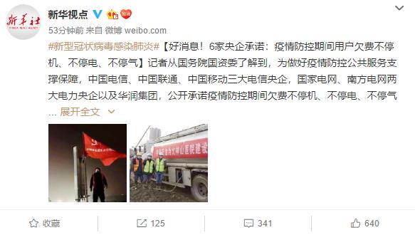 据新华视点报道,记者从国务院国资委了解到,为做好疫情防控公共服务支撑保障,中国电信、中国联通、中国移动三大电信央企,国家电网、南方电网两大电力央企以及华润集团,公开承诺疫情防控期间欠费不停机、不停电、不停气,保障居民正常生活,并推出用户足不出户即可办理业务的“云服务”等19项便民服务举措。
