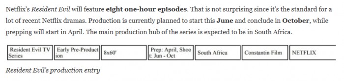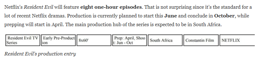 第一季共8集,每集时长为60分钟。该剧将在4月开始前期筹备,6月开拍,预计于10月拍摄完毕,主要取景地在南非。