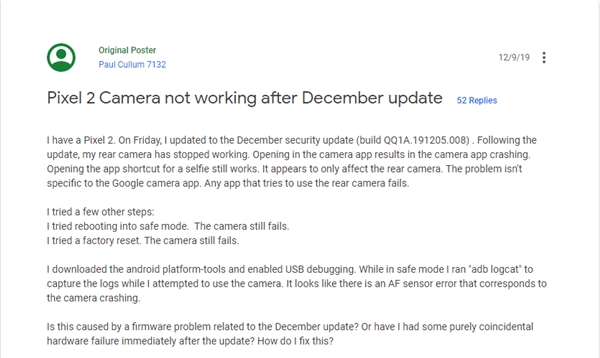 用户指出,将Pixel 2置于安全模式下或者是恢复出厂设置仍然不能解决问题,这可能与谷歌2019年12月份推送的安全更新有关,也有可能与Pixel 2的传感器硬件相关。