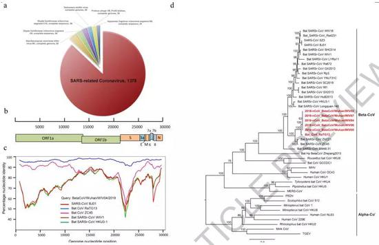 Fig。 1 | Genome characterization of 2019-nCoV。 a, pie chart showing metagenomics analysis of next-generation sequencing of bronchoalveolar lavage fluid from patient ICU06。 b, Genomic organization of 2019-nCoV WIV04。 c, Similarity plot based on the full-length genome sequence of 2019-nCoV WIV04。 Full-length genome sequences of SARS-CoV BJ01, bat SARSr-CoV WIV1,bat coronavirus RaTG13 and ZC45 were used as reference sequences.d, Phylogenetic tree based on nucleotide sequences of complete genomes ofcoronaviruses。 Software used and settings can be found in material and method section。