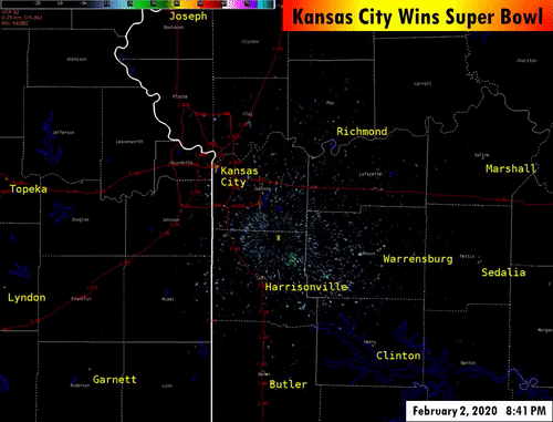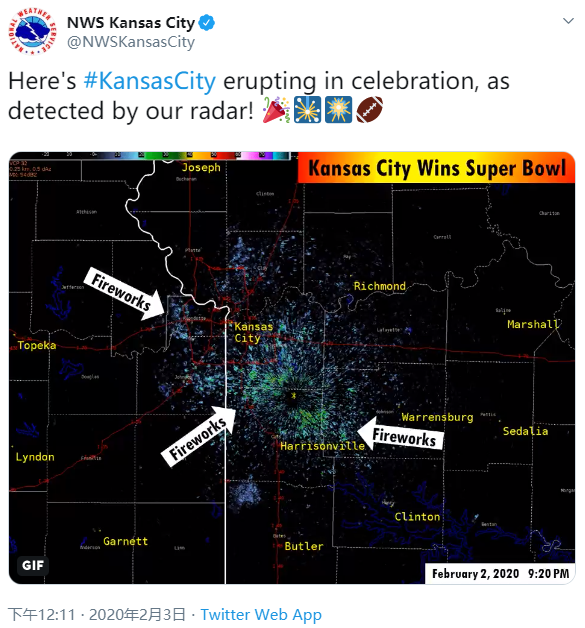 该机构发推文称:“在堪萨斯城的庆祝活动中,我们的雷达捕获了这些!”