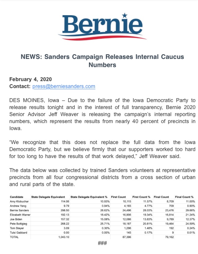 至少有四名民主党人有机会在星期一的爱荷华州的首次党团投票中获胜,并拿下数目可观的选举人票。这四个最有希望的选手是参议员伯尼·桑德斯,前副总统乔·拜登,参议员伊丽莎白·沃伦,印第安纳州本德市前市长皮特·布蒂贾奇。最近的民意测验显示竞争日趋激烈,而党团投票的性质又格外不确定,任何领先的参选人都可能在首轮初选中成为黑马。党团会议开始后不到半小时,美国总统唐纳德·川普在2020年爱荷华州共和党党内竞选中毫无悬念的获胜,迅速压制了他的两个鲜为人知的共和党对手。