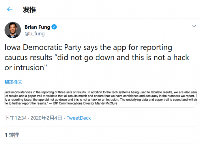 根据爱荷华州民主党称,本次技术延迟是由于新流程的投票“不一致”导致的,在此前手写选票和照片的基础上今年还使用了全新的技术系统。爱荷华州民主党通讯主管曼迪·麦克卢尔(Mandy McClure)在给CNN的一份声明中表示:“这仅仅是一个报告的问题,不过该APP并没有宕机崩溃,也没有出现任何破解和入侵。基础数据和书面投票都是正确的,只需要花费一些事件来同步投票结果。”